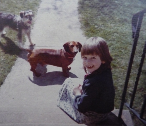 I liked to sit here and read. That's our dog, Schultzie, the schnauzer, and some neighbourhood dachshund. I'm about 6 years old. I don't remember that top, but I adored that long skirt - it had flowers on it.