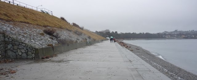 That is the Pacific Ocean, baby! On clear days, that grey horizon line is the Olympic Mountains, and sometimes you can even see the US city at the base of them. Today, just a harbour plane coming in, and a big barge on the right.I approach the coast with this on my right/back as I follow the shore turning left: