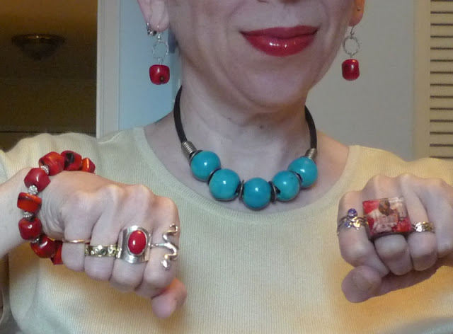 Wearing my new silk velvet poncho and turquoise bead choker!