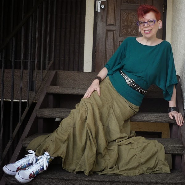 Top (Tabots, consignment), skirt (Cute Options), shoes (Kenneth Cole Reaction, consignment), cuff (Guess, thrifted), brown cuff (Hollyhawk, thrifted), belt (gift from Ruth).