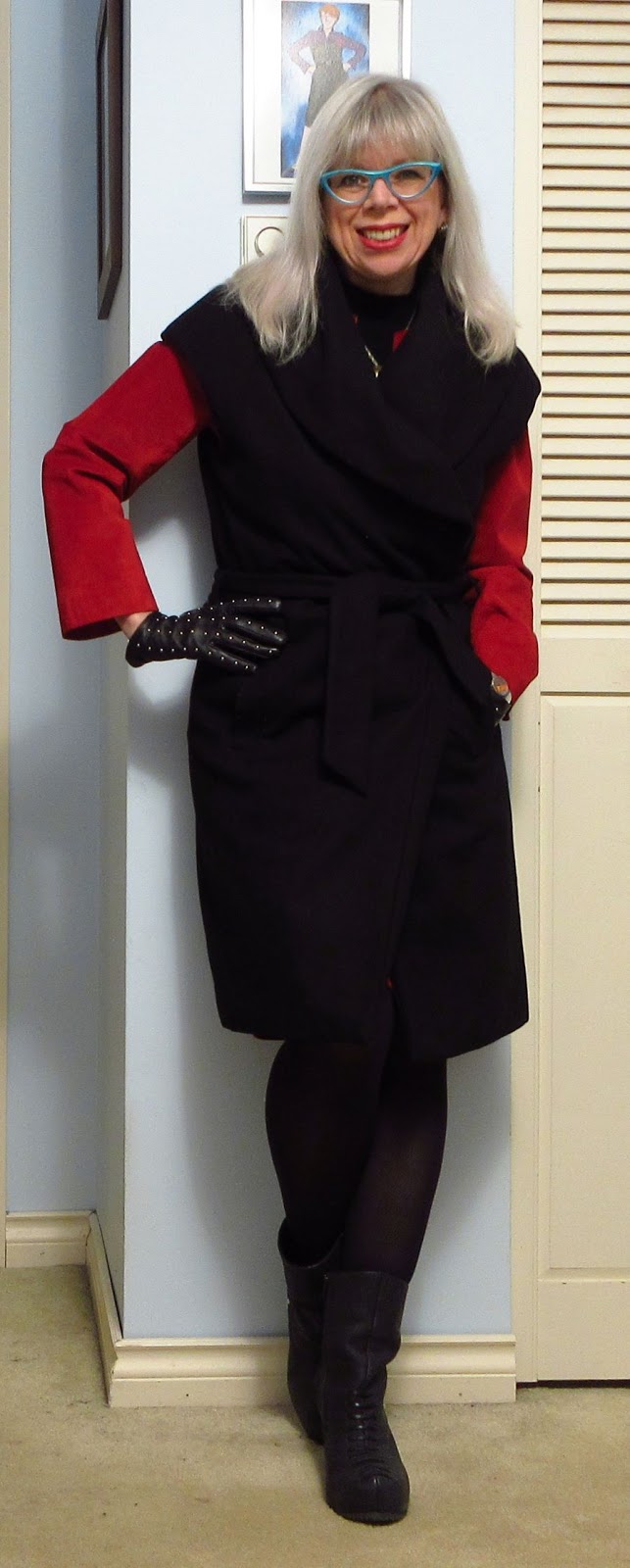 - Sleeveless coat (below) - Only, thrifted; last seen here on Monday