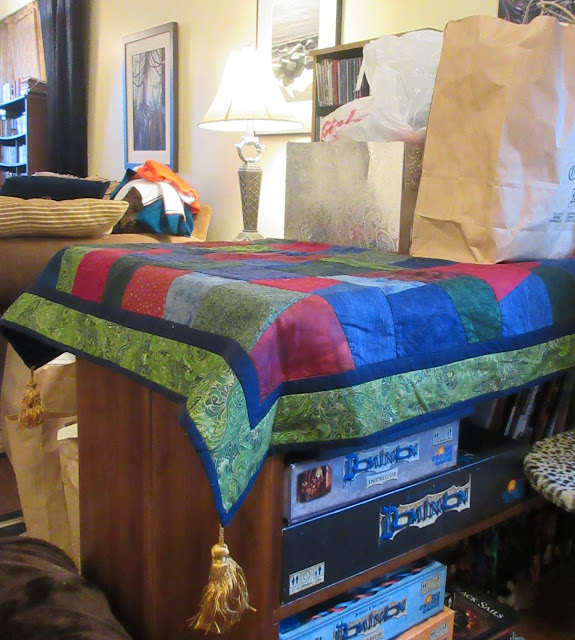 My Mom made this beautiful quilted table mat for our old coffee table, but it works great across these two back-to-back bookcases.