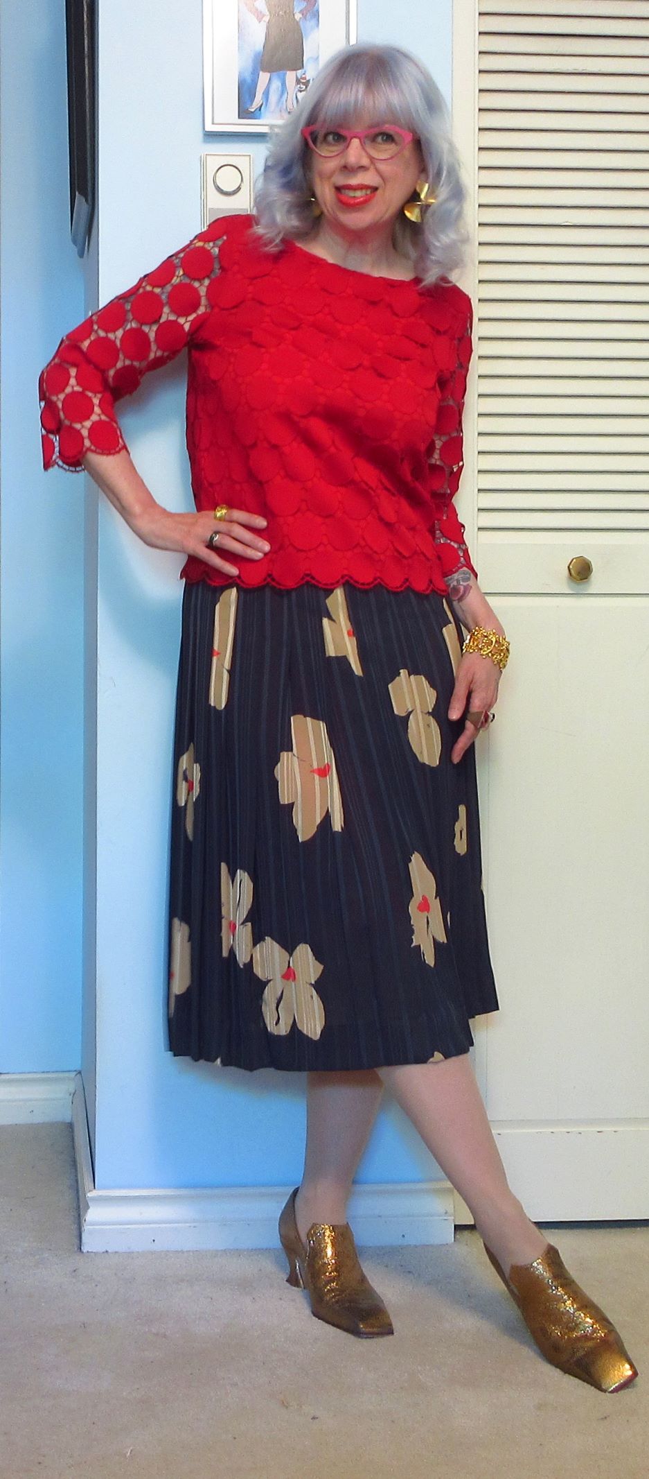 I made an outfit right away with my new-to-me "kisses" skirt (the red centres of the tan flowers look like lip-prints). It was awesome to wear, although the whole skirt rotated while I was walking home.