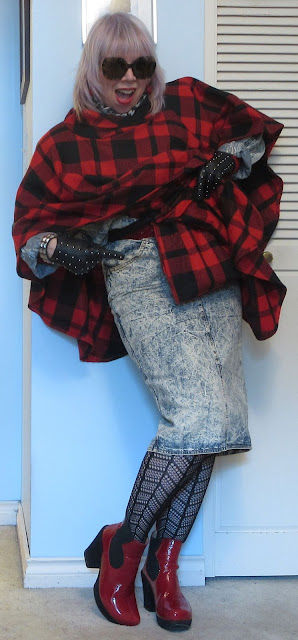 Wow, you scored some fab designer goods! I'm especially impressed with the Pucci tie, Escada body suit, and of course the Welsh wool cape/poncho - I used to have a purple one. Ever since you first posted about "Wonders" brand of shoes I've been on the lookout for them but no luck. I did go thrift shopping this weekend too, but no designer scores here. I love that acid washed dress on you - I admit, I was skeptical when you bought it, but it makes a badass cool outfit with the red accents.