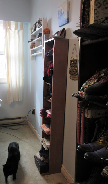 The shoe box on the bottom is full of my spring-summer jewelry. I'm leery of all of L's fringed scarves on top of that, but Vizzini hasn't really shown any interest in eating them (yet).