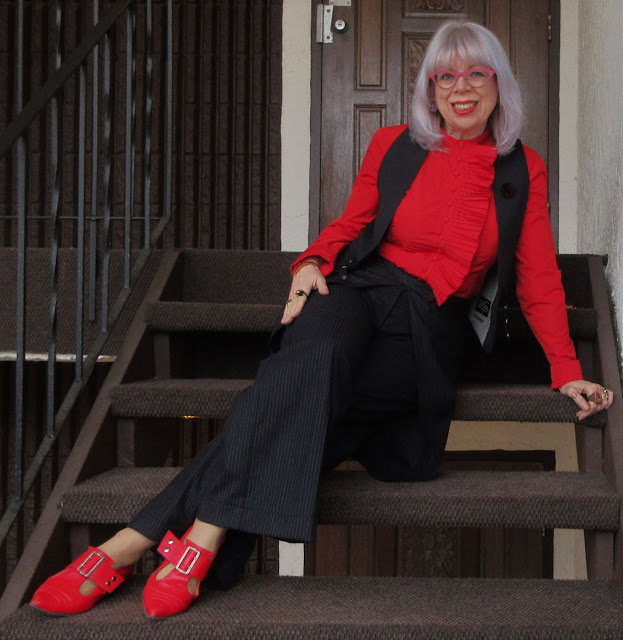 But first, here's today's Reader Request, which comes from Ann of Polyester Princess (here, link 'cause I love!). She requested a repeat wearing of this lovely red ruffled blouse.