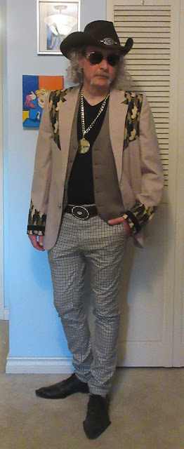 Best $5 I ever spent - that blazer's been in heavy rotation in L's closet all summer. He's wearing a thrifted vintage vest, the new trousers, a thrifted belt buckle, and Fluevog Cooper Swordfish shoes. The cowboy hat is from Nashville, Tennessee, and the pendant is from Run The Jewels' 2017 album release, a gift to L from the local record shop.